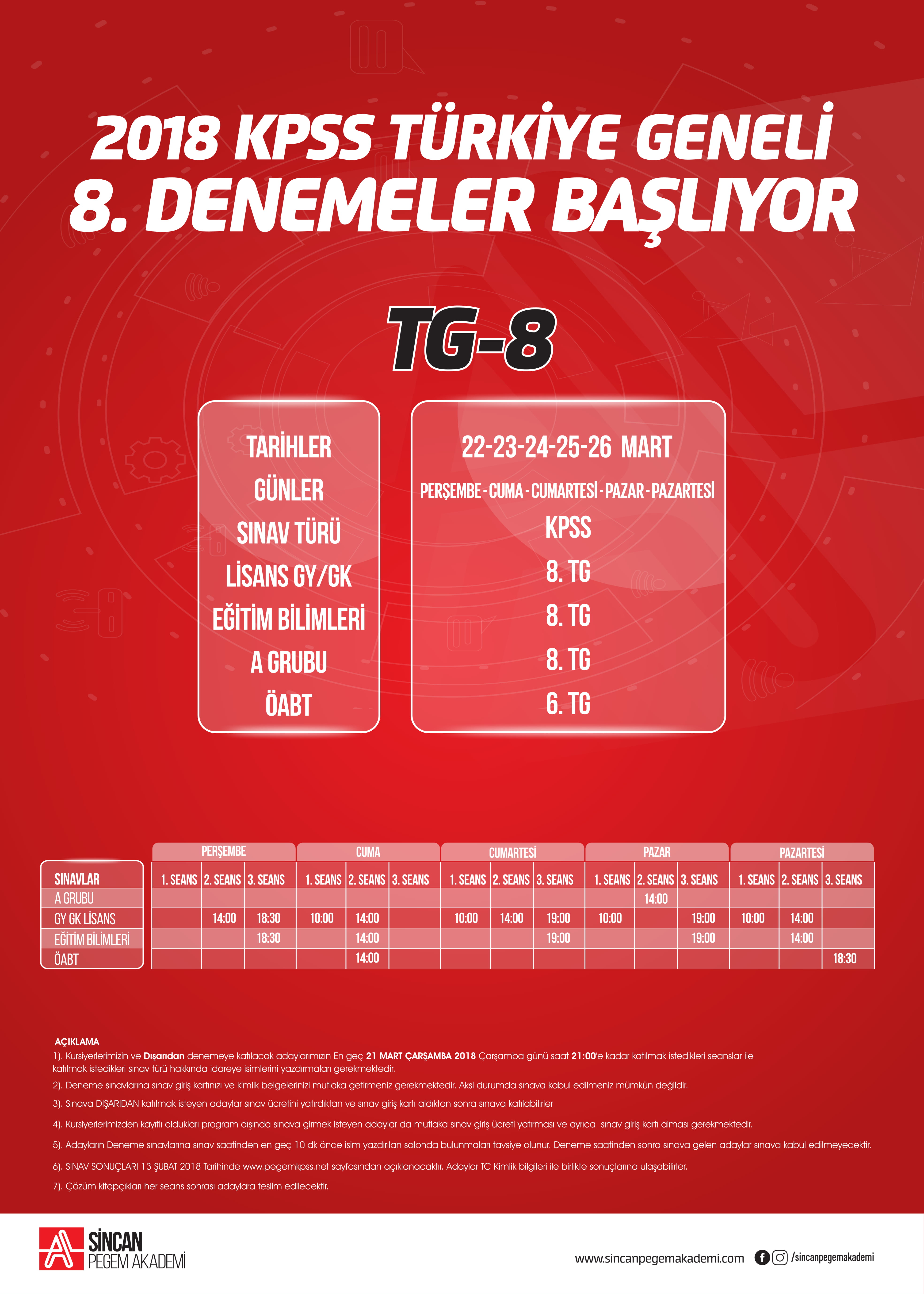 6) SINAV SONUÇLARI En Geç 3 Nisan 2018 Tarihinde www.pegemkpss.netsayfasından açıklanacaktır. Adaylar TC Kimlik bilgileri ile birlikte sonuçlarına ulaşabilirler.
