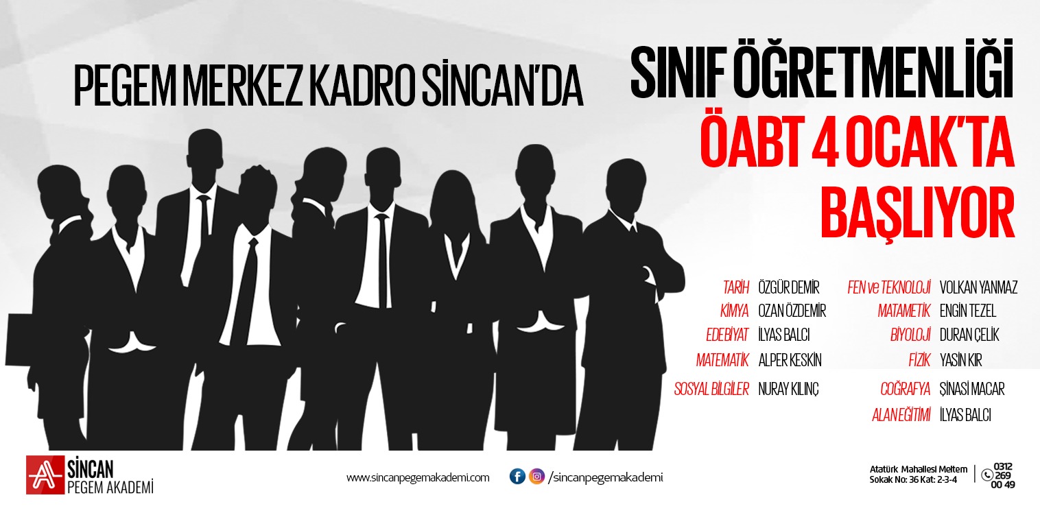 04 Ocak'tan itibaren Pegem Akademi Genel Merkez kadrosuyla Sincan'da SINIF Öğretmenliği ÖABT programı başlıyor. Sınırlı sayıda kontenjandan yararlanmak için https://sincan.pegemakademi.com/on-kayit formu doldurmanız yeterlidir. Uzmanlarımız size daha kaliteli zaman ayırmak için en kısa sürede randevunuzu oluşturacaktır.